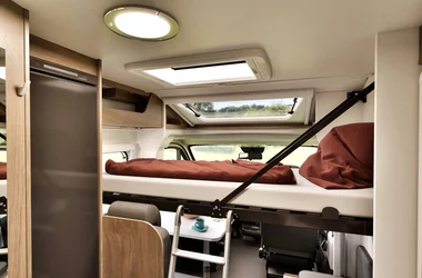 Ob zu zweit oder mit bis zu vier Personen unterwegs – das absenkbare Bett schafft flexible Schlafmöglichkeiten, ohne auf wertvollen Wohnraum verzichten zu müssen. Tagsüber öffnet es den Blick auf einen komfortablen Wohn- und Küchenbereich, während es nachts für erholsamen Schlaf sorgt.