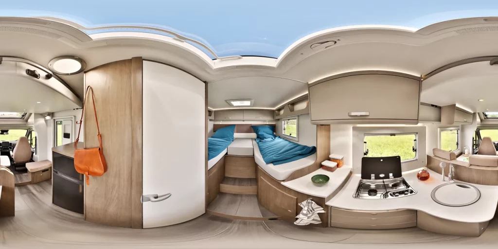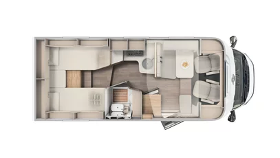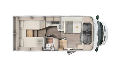 Raumfunktion pur: Extra lange Einzelbetten bei kurzer Gesamtlänge. Und durch das optionale Hubbett findet die ganze Familie Platz.Teilintegriertes Wohnmobil T338